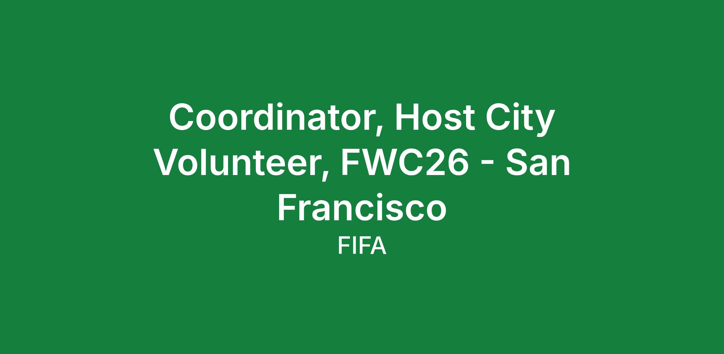 The PositionReporting organizationally to FIFA’s Host City Manager, the Volunteer Coordinator for San Francisco will help serve Volunteer efforts for the FIFA World Cup 2026TM that for the first time ever, is hosting 48 teams and 1,200+ players across 3 countries and 16 cities.