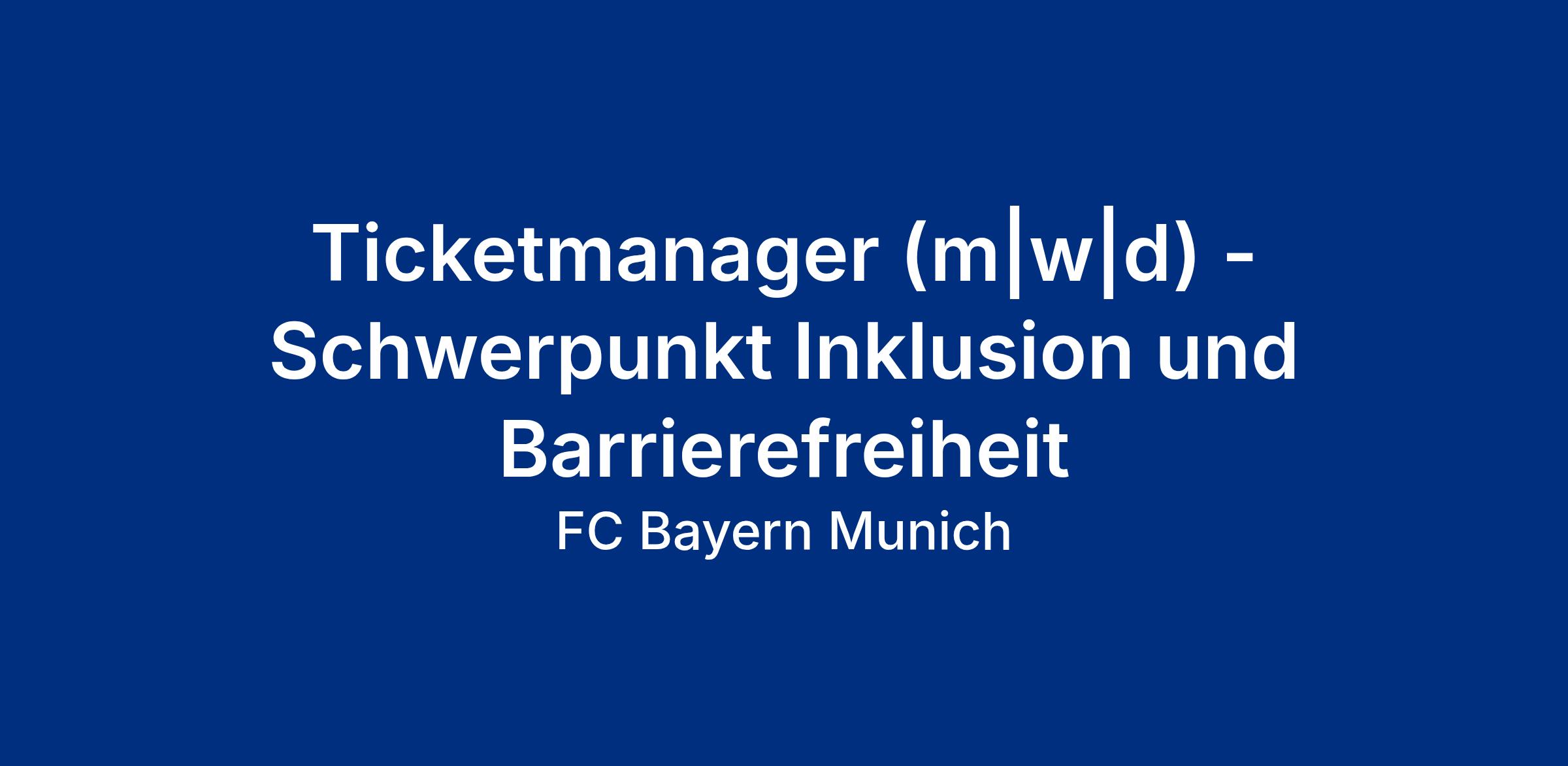 Der FC Bayern München ist einer der erfolgreichsten Fußballclubs der Welt und steht auch abseits des Fußballplatzes für Erfolg, Inspiration und Engagement. Zur Verstärkung unserer Direktion Spieltagsorganisation, Ticketing, Sicherheit & Facility Management suchen wir an unserem Standort Säbener Straße ab soforteinen Ticketmanager (m|w|d)mitSchwerpunkt Inklusion und Barrierefreiheit in Teilzeit(20 Std./Woche).